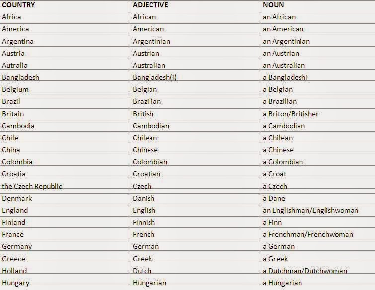В том, как именно они образуются, существуют определённые закономерности, но они слишком сложны и в них слишком много исключений, чтобы ими можно было уверенно пользоваться. Гораздо надёжнее обратиться к списку правильного написания и произношения названий стран и национальностей на английском языке, и при необходимости с ним сверяться. Подобный список вы найдете ниже.